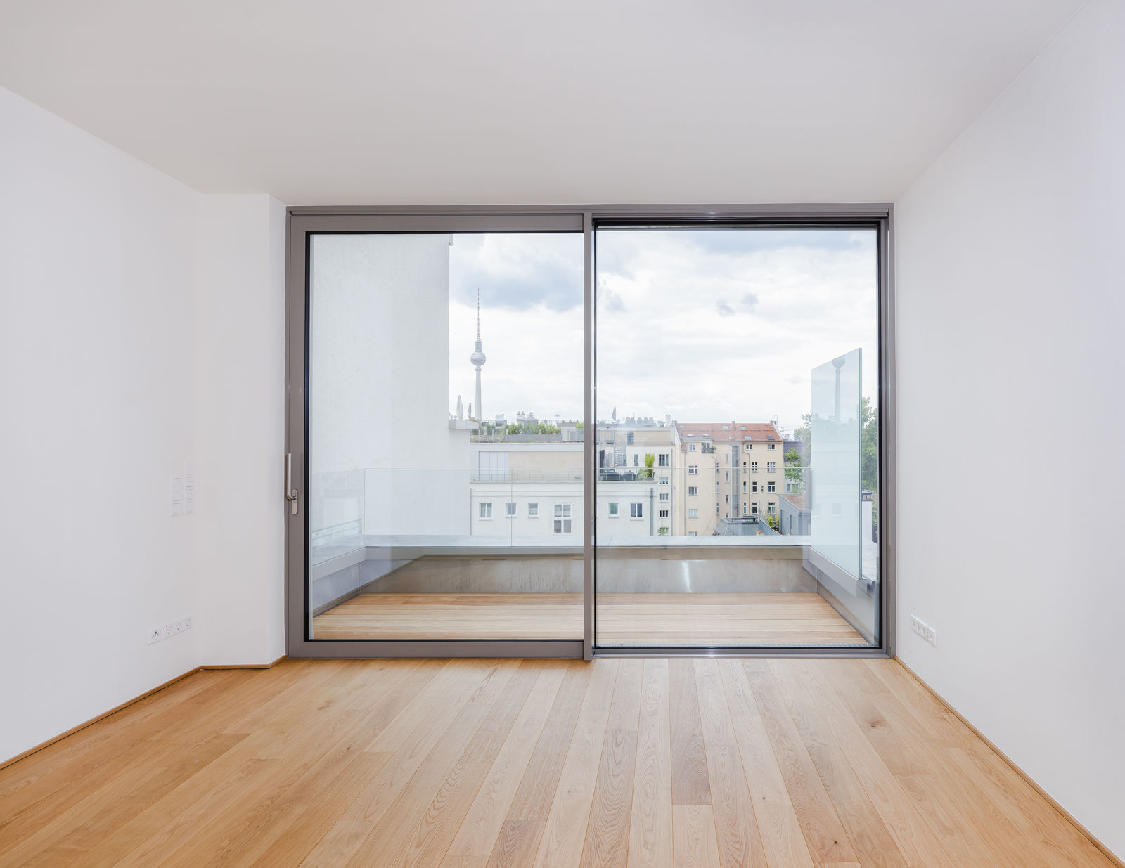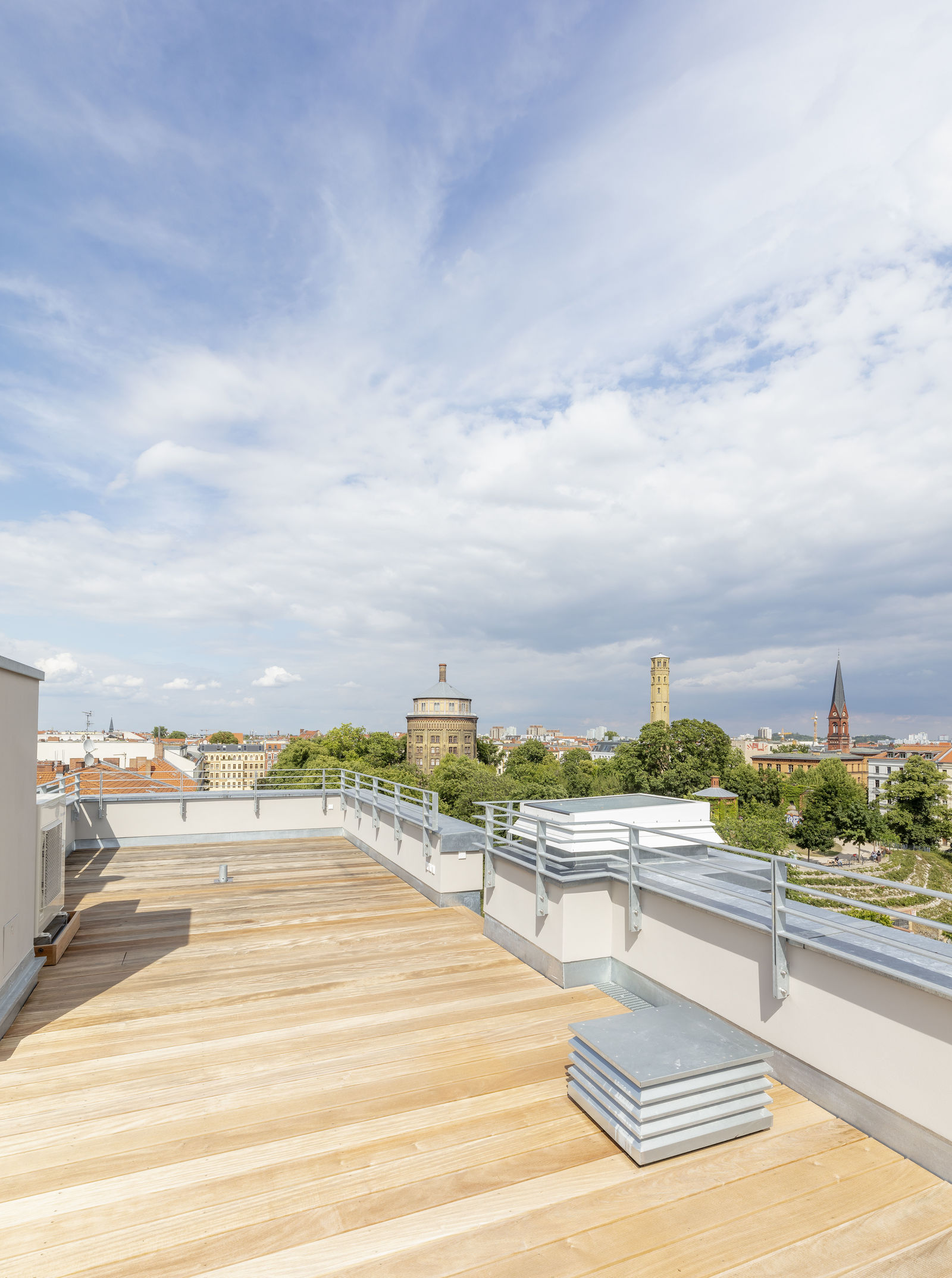Zur Verfügung standen eine Baulücke von 480 cm Breite mit einer Bautiefe von 1700 cm. Trotz dieses schmalen geometrischen Grats entstanden raffiniert geschnittene Grundrisse durchgesteckter Wohnungen, die Großzügigkeit ausstrahlen. Alle Wohnungen und die Gewerbeeinheit im Erdgeschoss haben eines gemeinsam: während sich gen Norden durch großzügige Eckfenster der weite Blick auf den belebten Wasserturmplatz eröffnet, nehmen die gebäudebreiten Balkon- und Terrassenfenster im Süden die ruhige Atmosphäre des große Hofgartens auf. On Top gibt es den atemberaubenden Rundblick über Berlin.